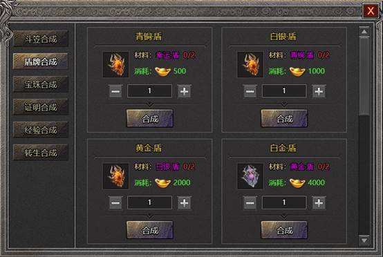 1. 可通过消耗合成材料、货币将低级盾牌合成升级为高级盾牌