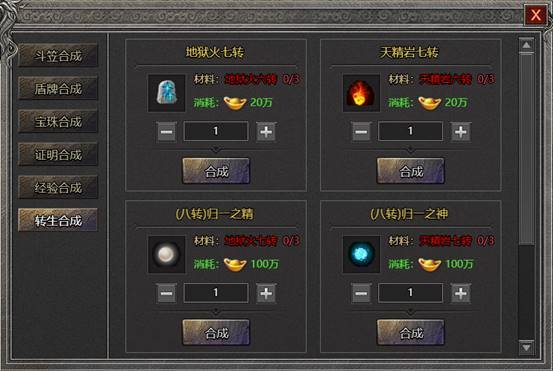 1. 可通过消耗货币、材料合成转生道具;