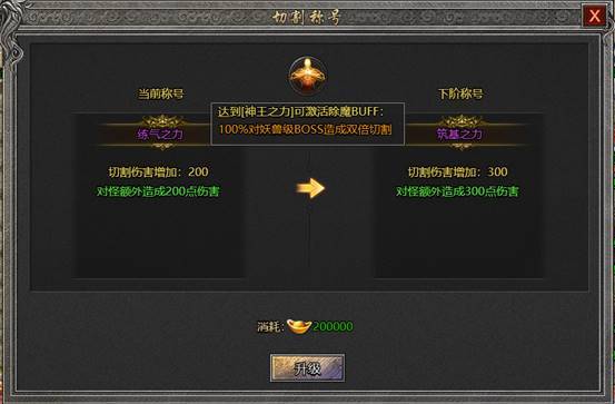 升级切割称号可增加对怪物切割伤害属性