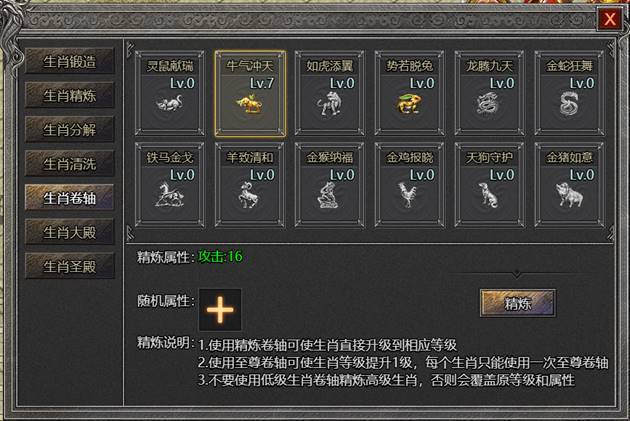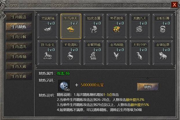 2. 生肖精炼:消耗生肖碎片对生肖装备进行精炼,每次精炼可随机提升1-3点攻击,当攻击达到26点以上时,可获得攻击加成属性;