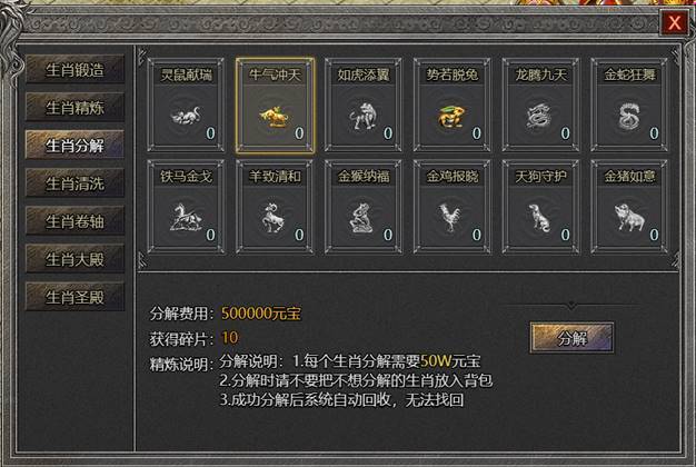 4. 生肖分解:可将背包的生肖进行分解,获得生肖碎片