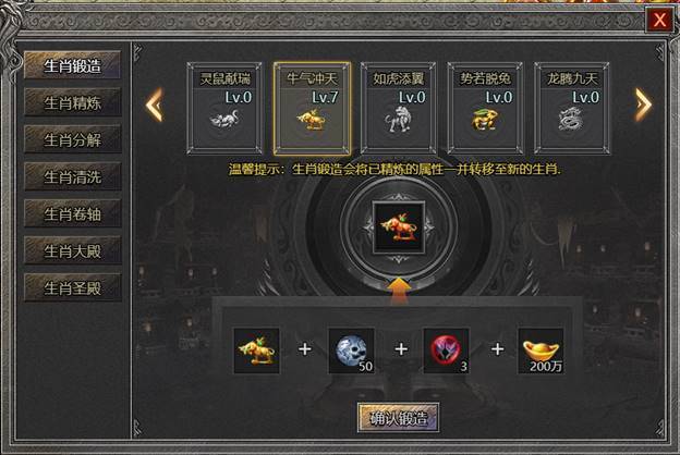 1.生肖锻造:对生肖装备进行锻造升级,提升生肖装备属性;