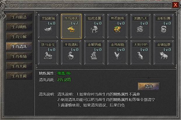 5.生肖清洗:对精炼不满意的生肖,可进行精炼清洗,将精炼等级重置为0,可重新进行精炼;